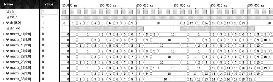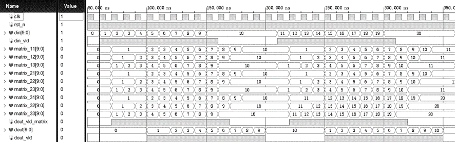 )。如果是则将行计数器清零;如果不是则递增行计数器。在每个时钟周期的结束阶段,将 din_vld 的当前状态赋值给 din_vld_pre