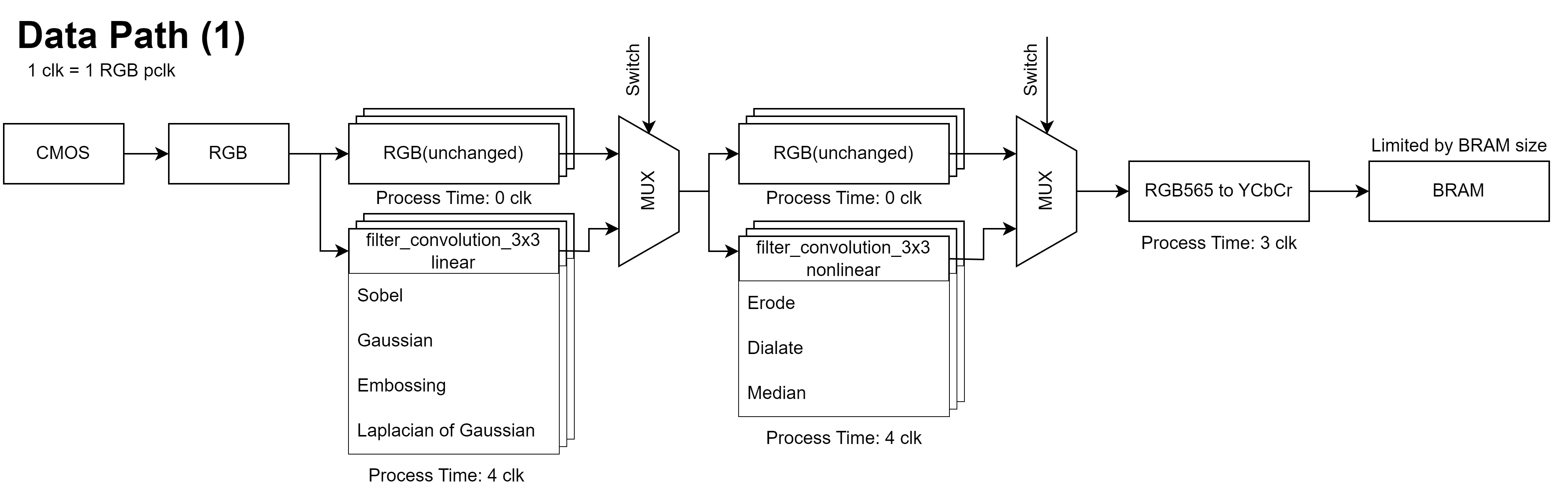 再次,图像数据的三个RGB通道分别连接到了一个选择器与一个非线性图像滤波器,在滤波器这个分支对图像数据进行了处理和对同步信号的延迟。最后汇集到一个数据选择器上根据需要,选择输出不同的处理过程。