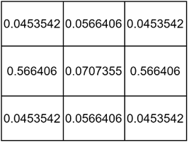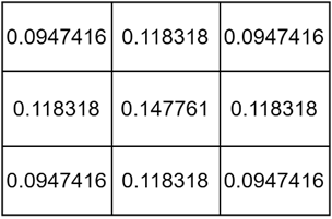 直接从离散高斯分布中计算模板值,假设中心点坐标是(0,0),取离它最近的8个点,设 $\sigma=1.5$,则模糊半径为1的高斯核如图4.5左侧,根据中心点距离坐标,取得每个位置的高斯函数的数值如图4.5中,进行归一化后,实际取值为图4.5右侧。