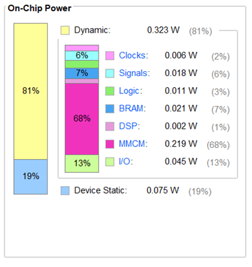 动态功耗:总共0.332瓦特,占比82%,主要集中在以下模块:时钟管理器(MMCM):最高功耗为0.219瓦特,占动态功耗的66%。I/O:0.048瓦特,占14%。信号:0.022瓦特,占7%。逻辑:0.013瓦特,占4%。块RAM (BRAM):0.022瓦特,占6%。DSP:0.002瓦特,占1%。时钟:0.005瓦特,占2%。