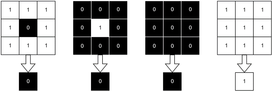 腐蚀(Erode)是一种取卷积窗口最小值的滤波,也就是用卷积核中的最小值作为中心像素的像素值,对于黑色背景,白色线条的图像经过腐蚀后的效果简单来说就是线条会变细。以本次设计的 3×3 卷积核,图示如下: