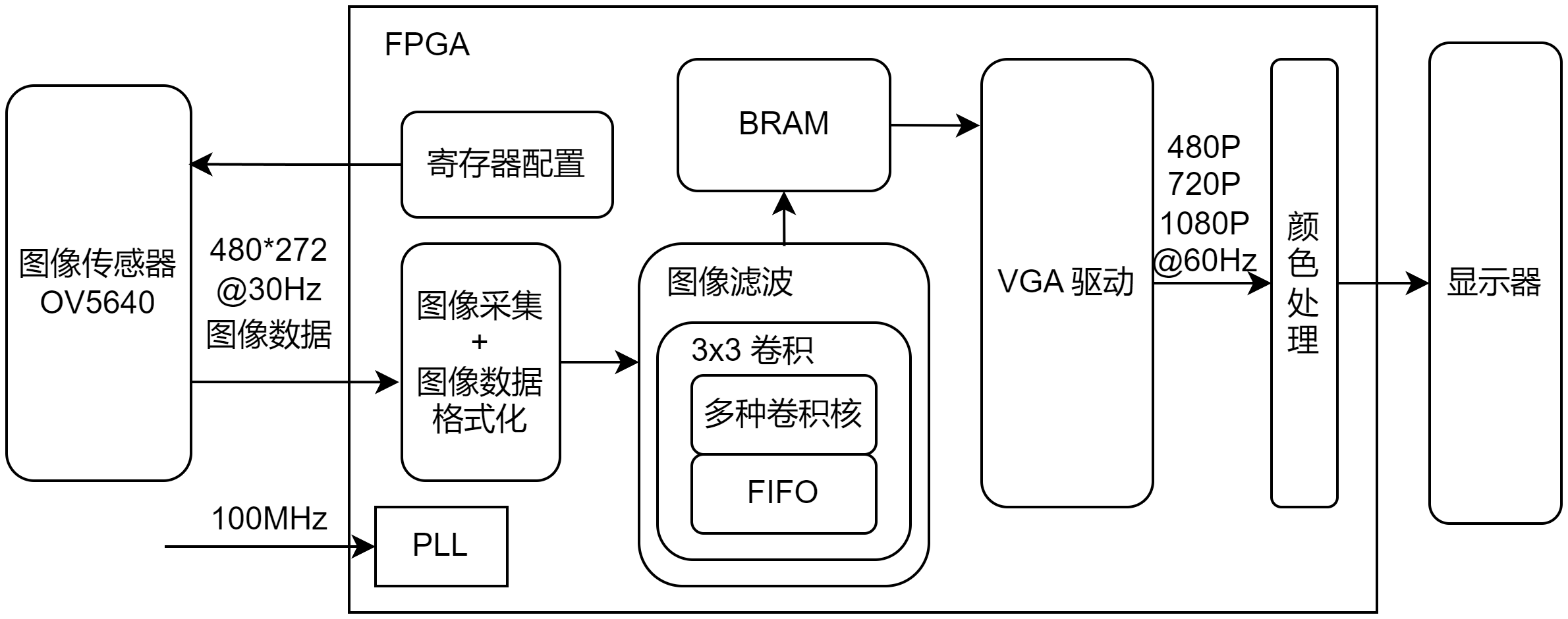 Verilog为开发语言,针对摄像头所采集的实时图像进行处理,分别描述了图像卷积算法、图像滤波算法,以及边缘检测和形态学滤波等算法,处理的结果实时显示在VGA显示器上。