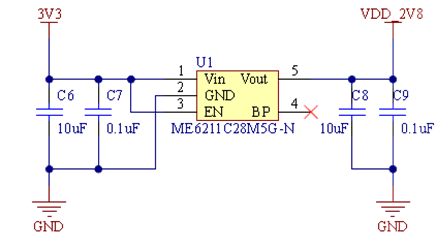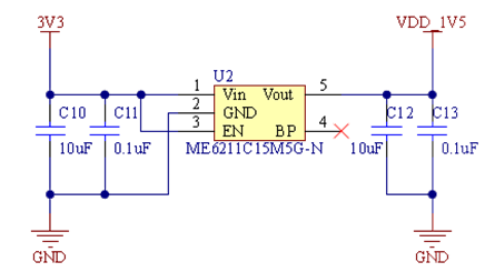 转接板的转换电压由输入提供的 3.3V 直流电源,经过两个专门的低压差线性稳压器(LDO),ME6211C28M5G-N 和 ME6211C15M5G-N,进行电压调节和降压,最终为摄像头提供所需的高质量稳定电源。这里使用ME6211C28M5G-N稳压器负责输出2.8V的电压,ME6211C15M5G-N 输出 1.5V 的电压,这样的电压组合常适用于对电源敏感的摄像头系统中,因为不同的电路部分需要不同的电压级。