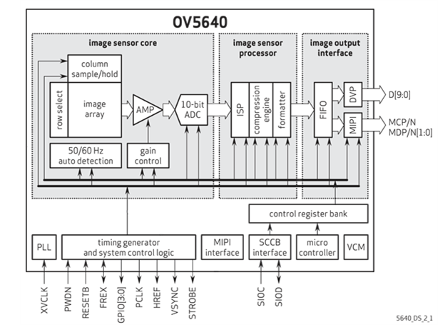 本文所采用的是豪威科技公司的 OV5640 图像传感器,这是一款1/4英寸的单芯片图像传感器。OV5640