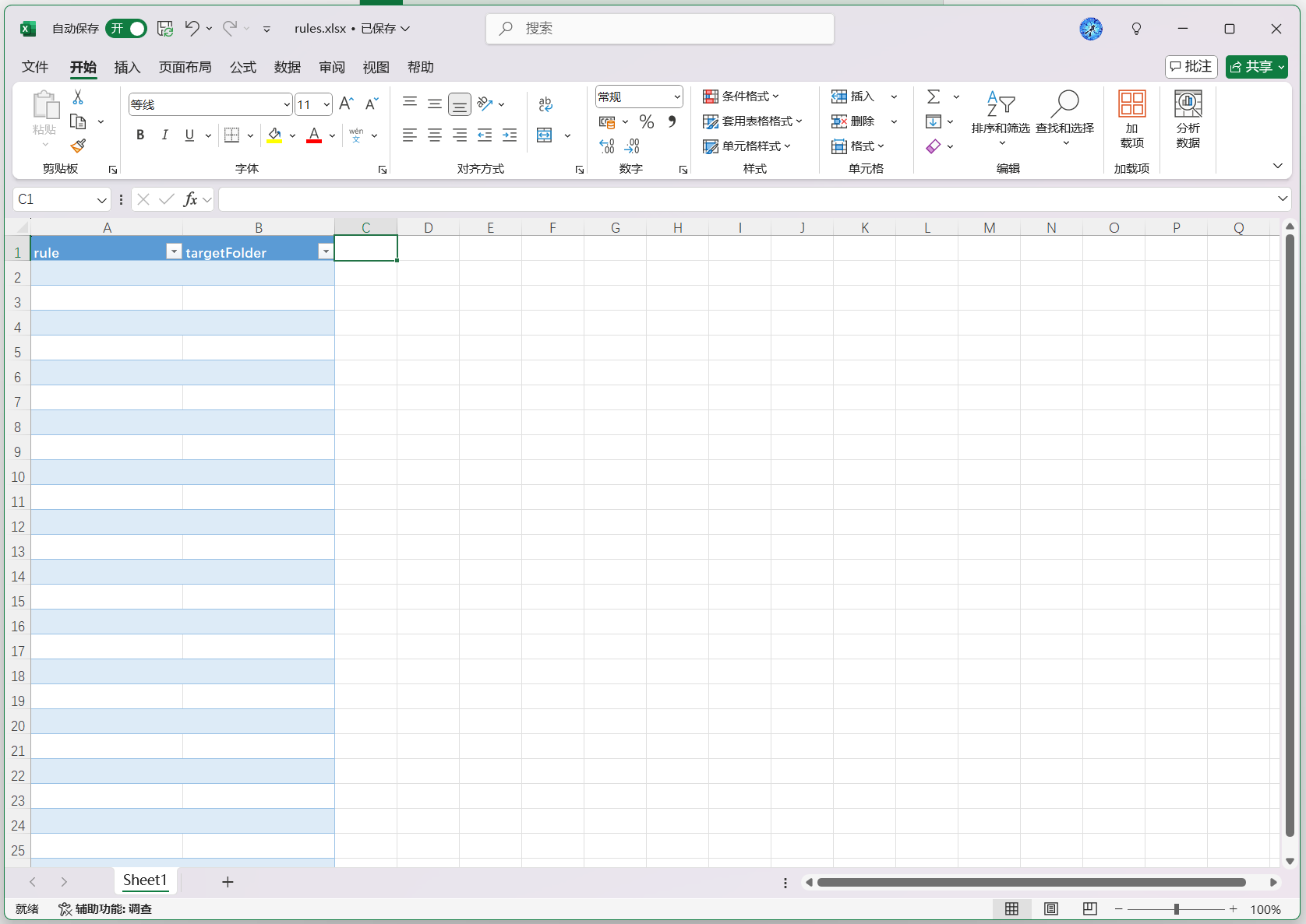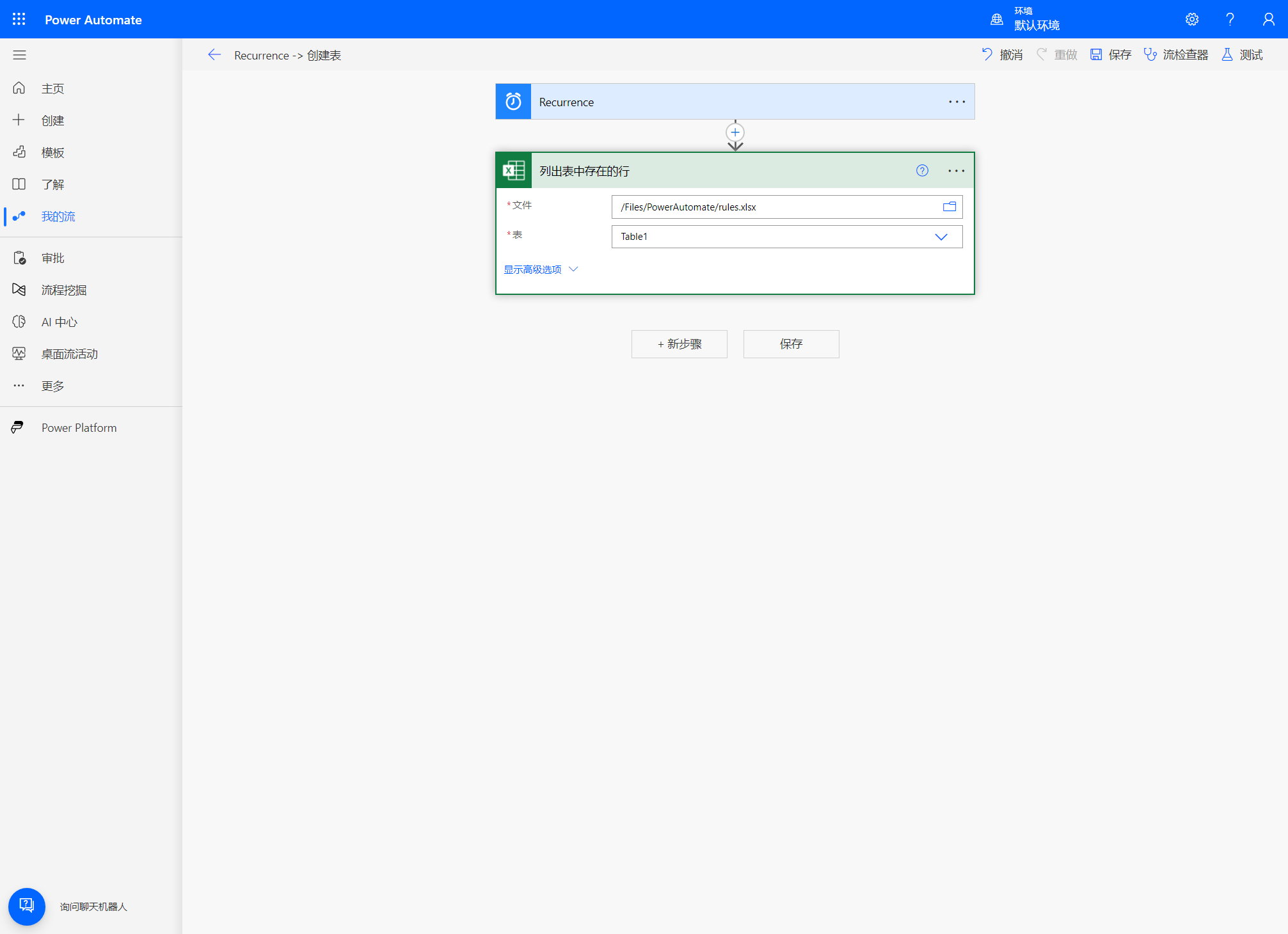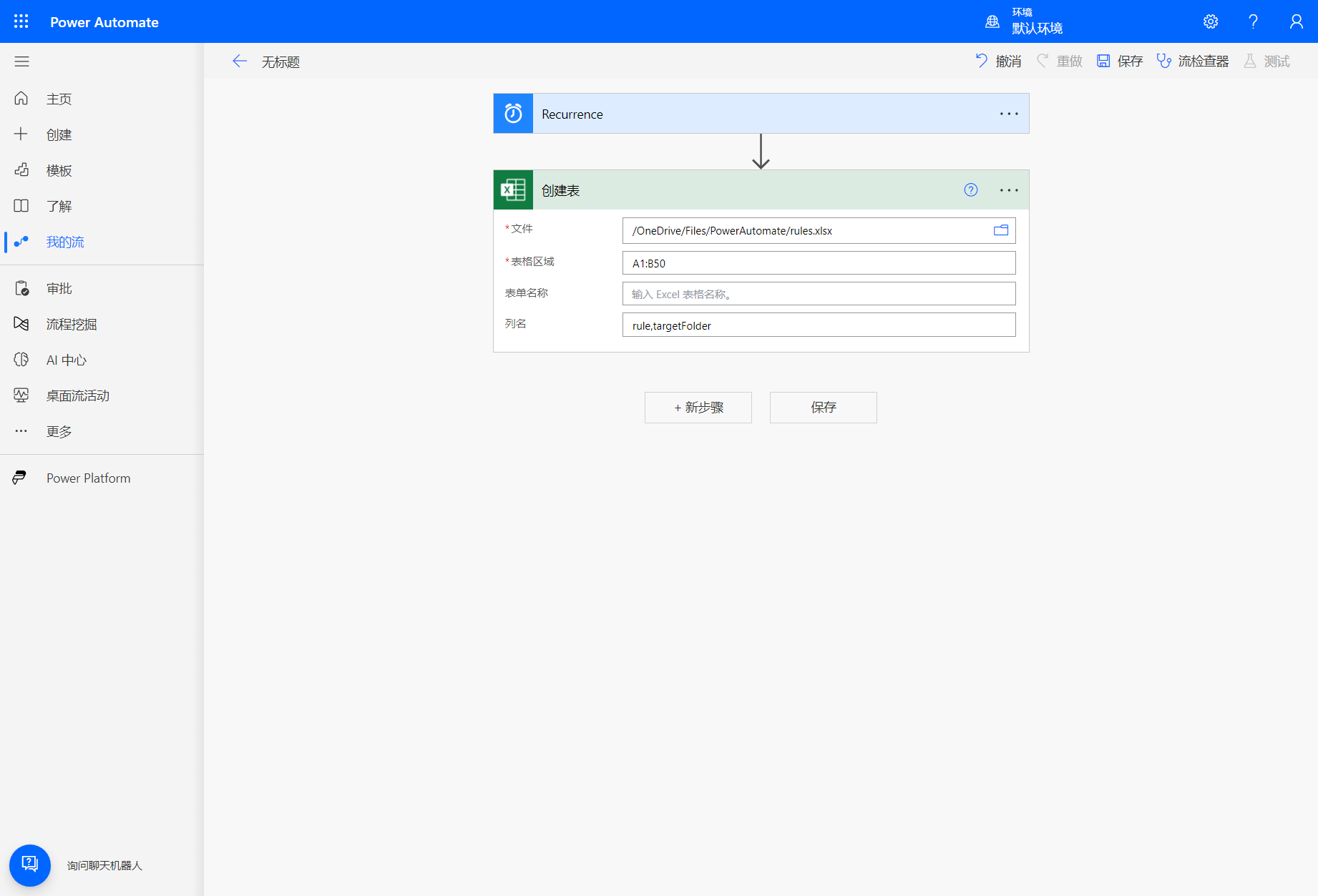 在这一步之前我们需要先手动在 Onedrive 中创建一个表格文件,例如’/OneDrive/Files/PowerAutomate/rules.xlsx’。 现在有了表格文件,其中默认自带工作表’Sheet1’,还需要在工作表’Sheet1’中创建表,也就是指定区域用于存储数据。