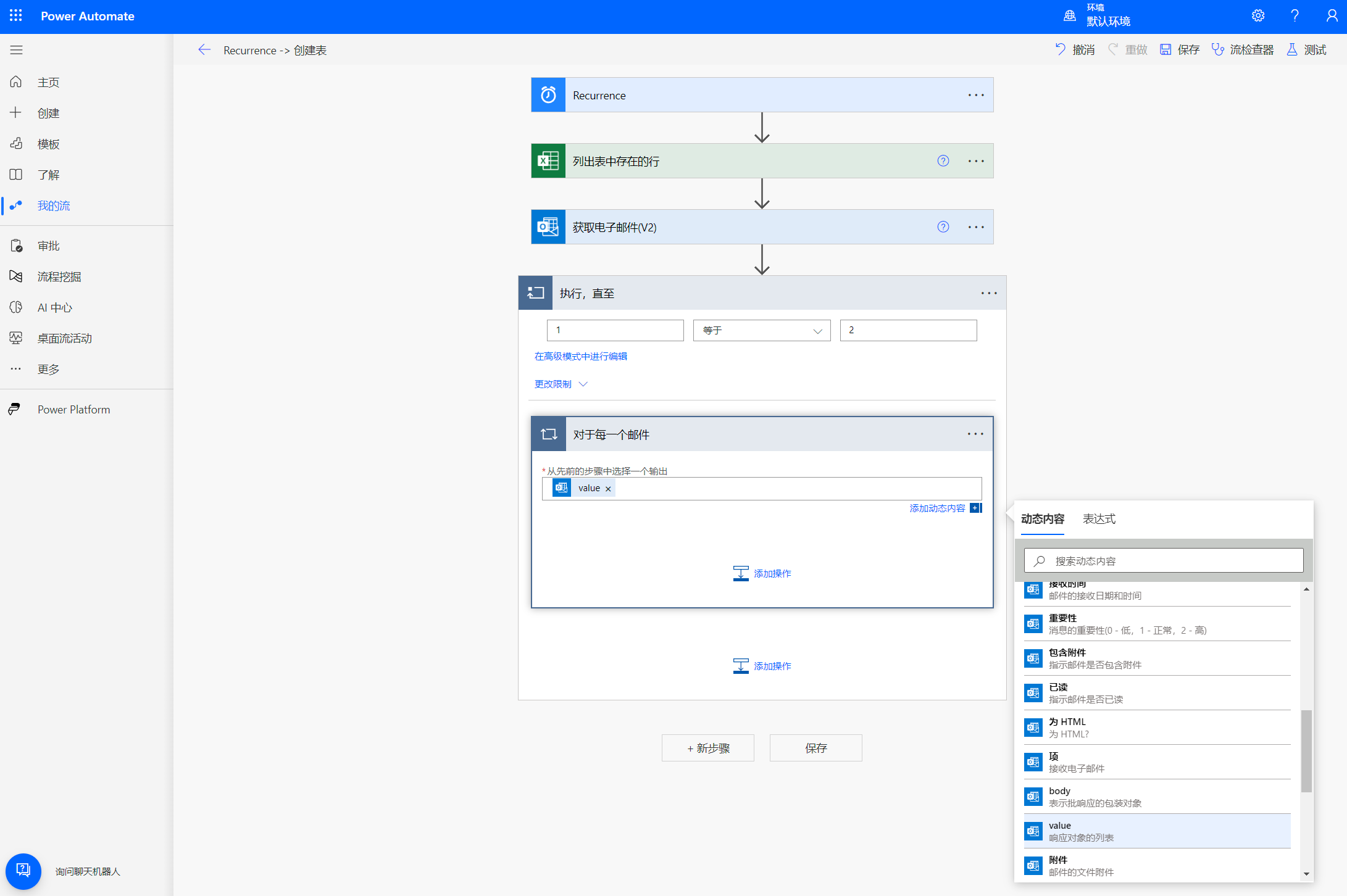 从弹出的窗口中选择’动态内容’中’获取电子邮件(V2)‘的’value’